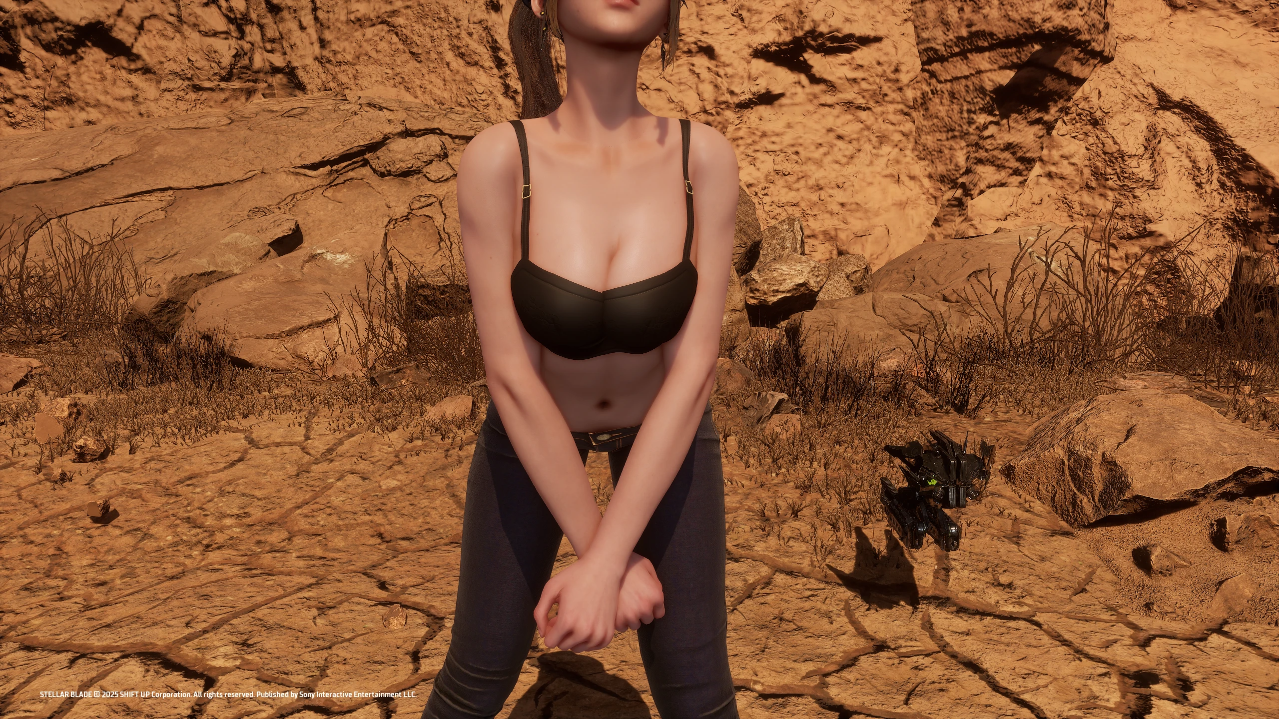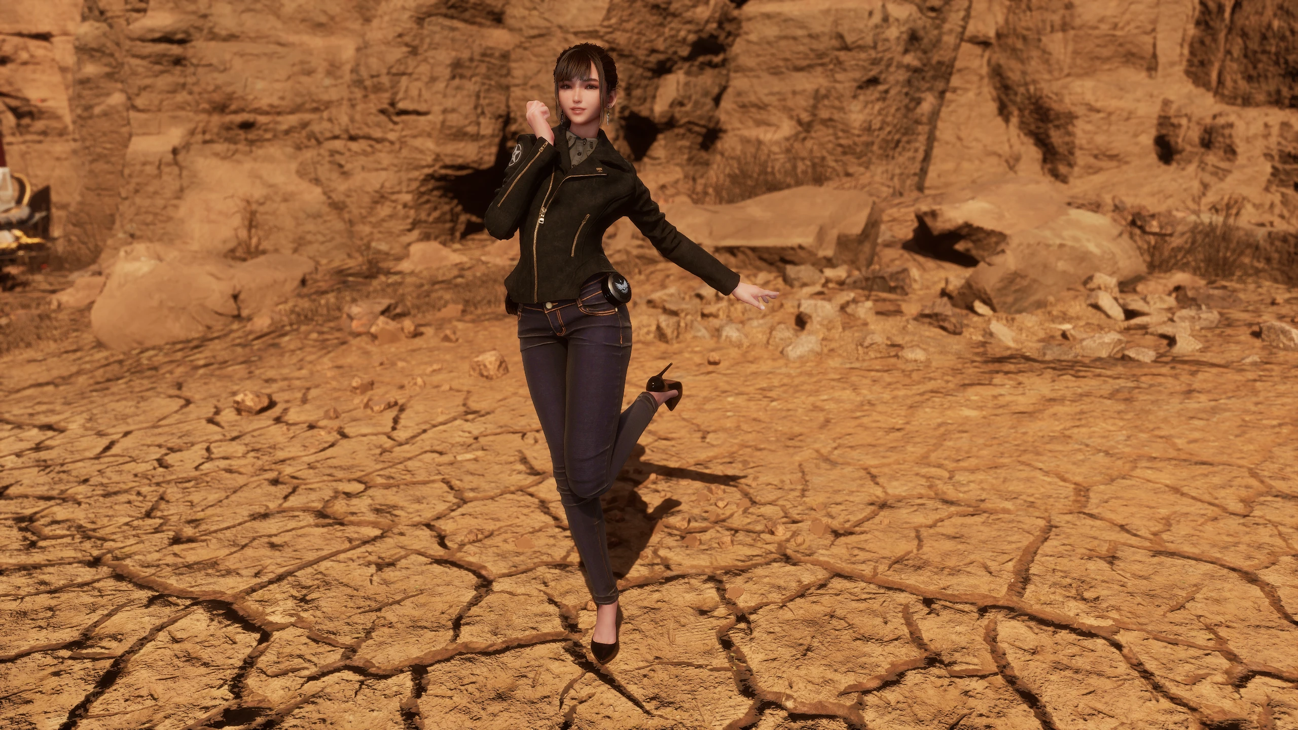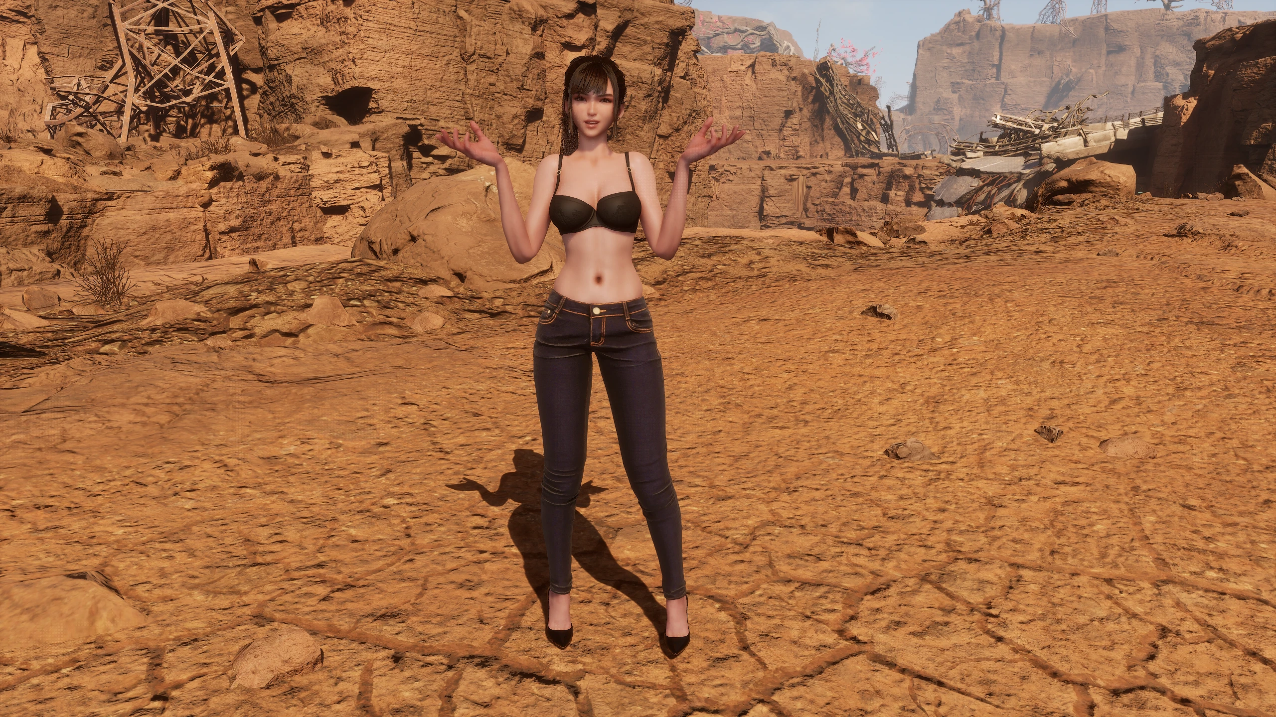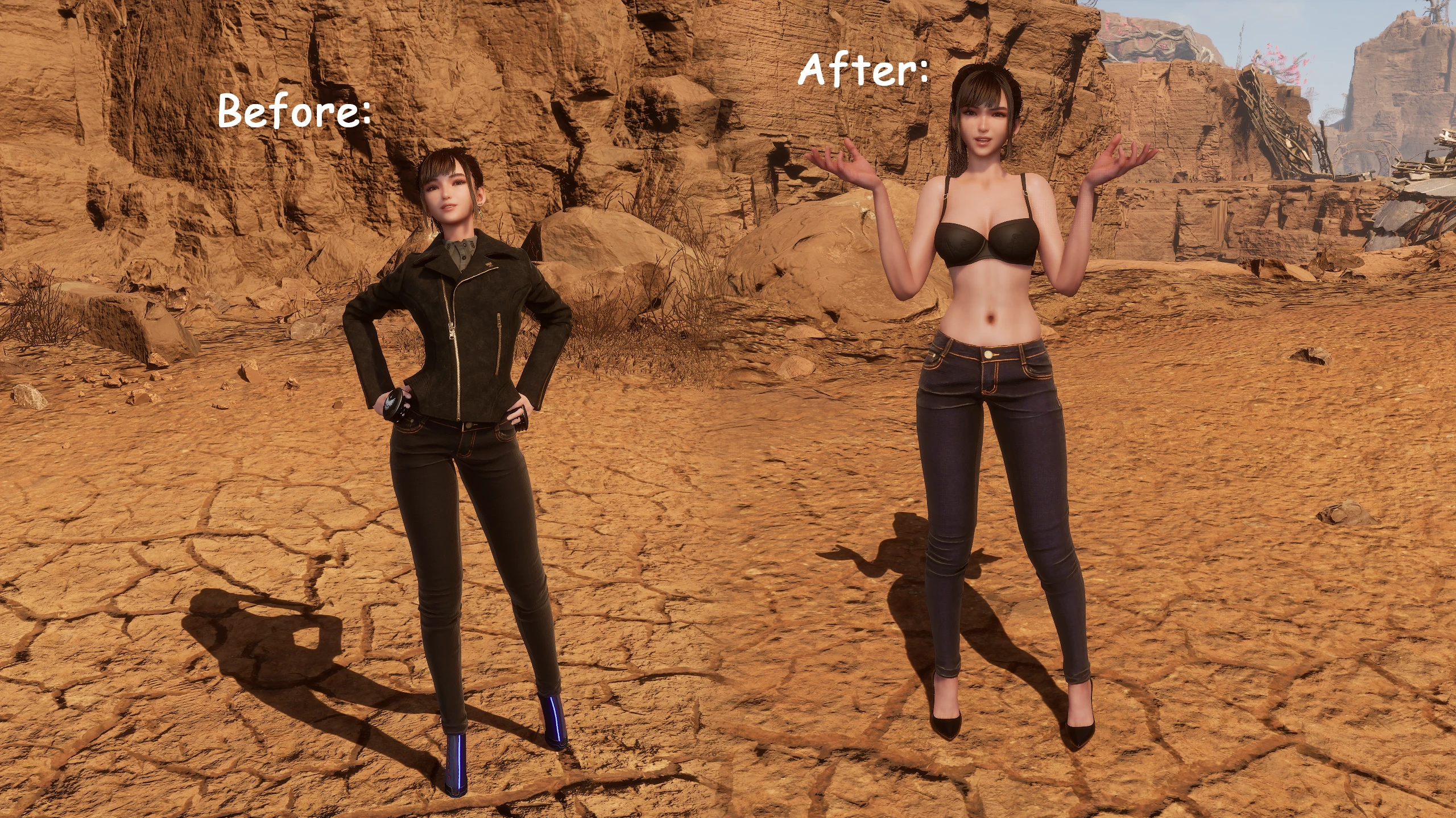 Who doesn't love a woman in jeans? Unfortunately, the developers messed it up by giving her weird pony boots instead of heels, whereas they opted for regular heels in other outfits. While I was at it, I thought, hey, why not remove the jacket too?