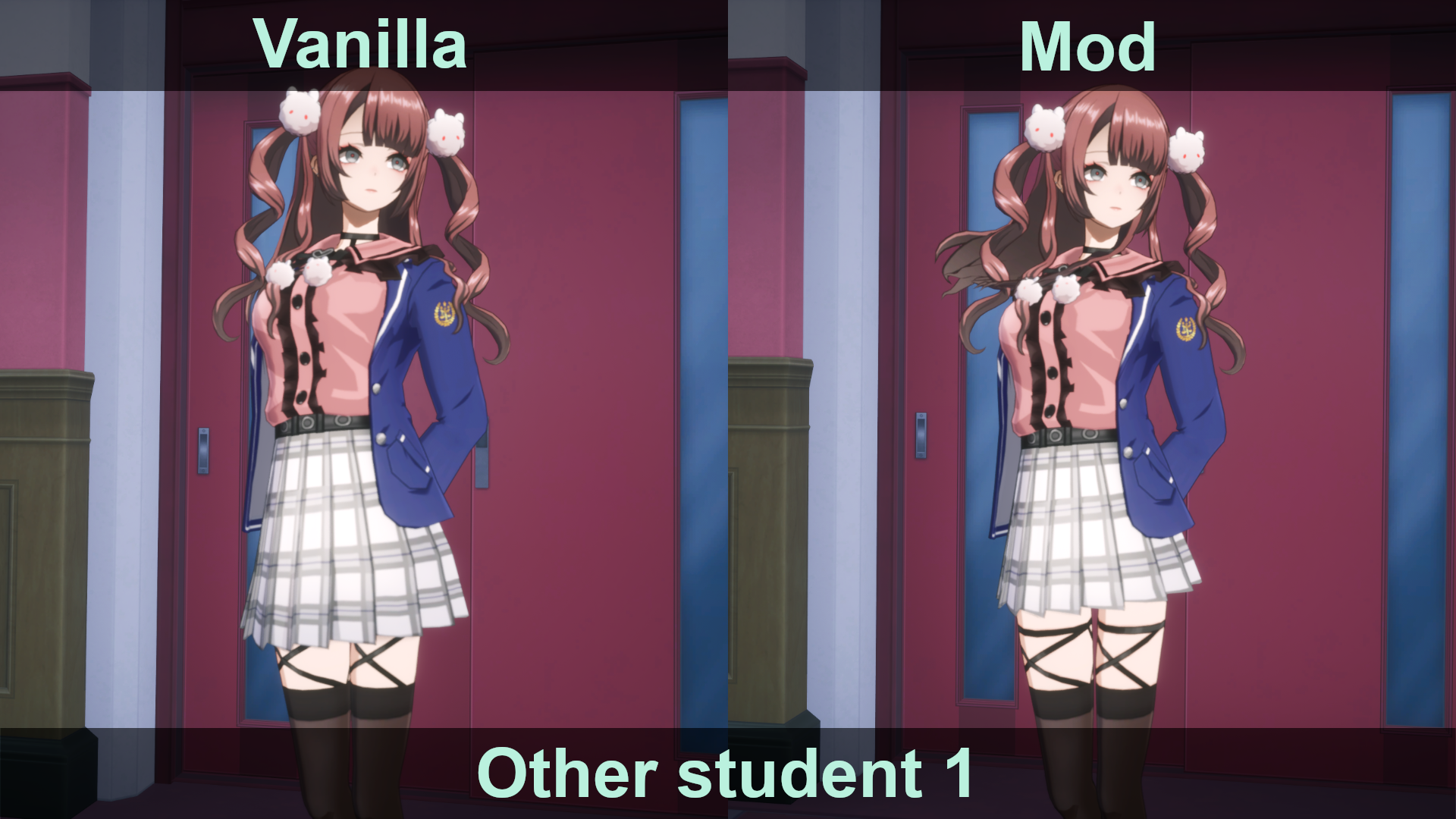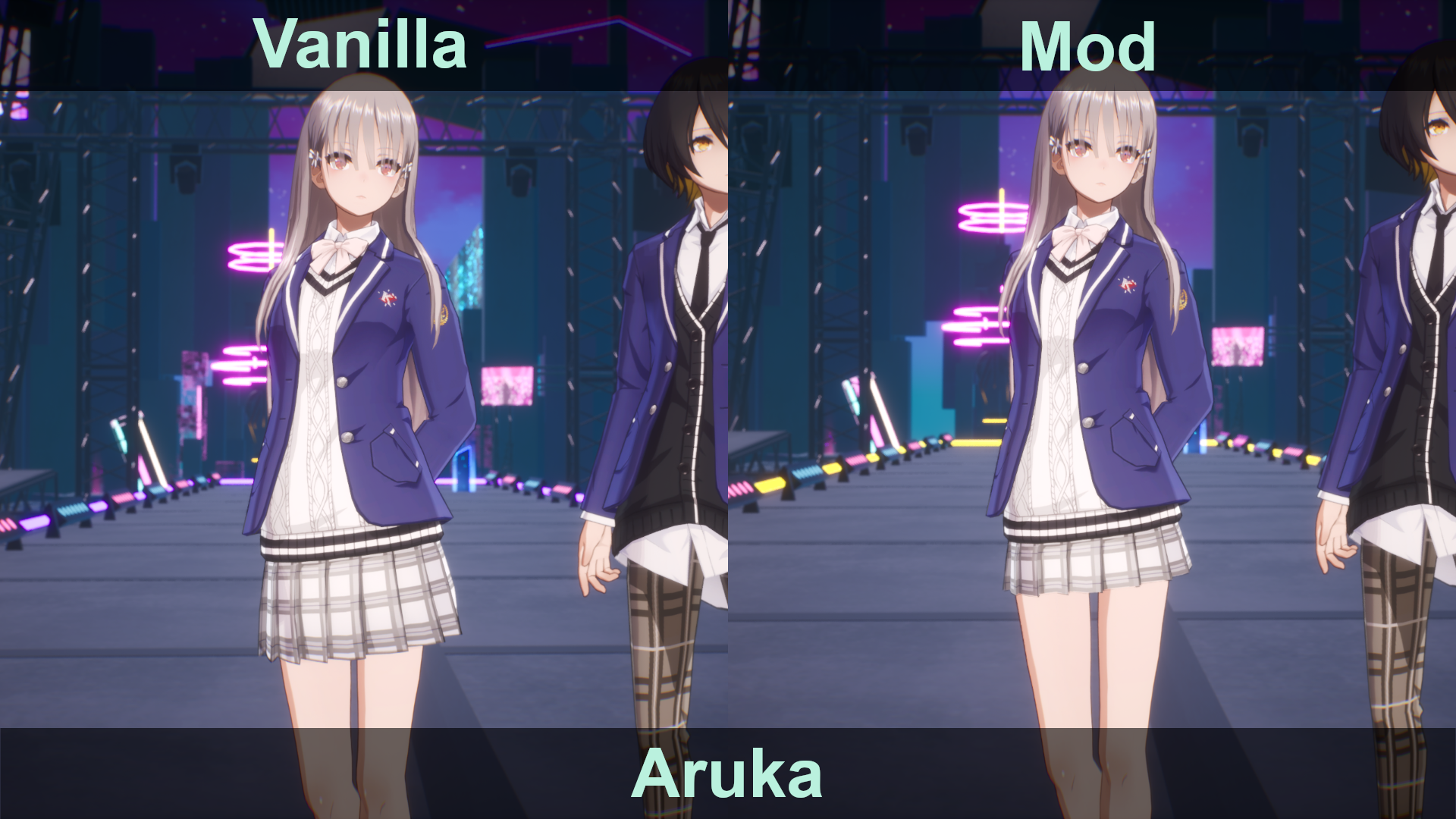 The skirts of SSS-affiliated female students and other female students (not wearing tights) will be shortened slightly. Noa and Yuri will change their tights to socks.