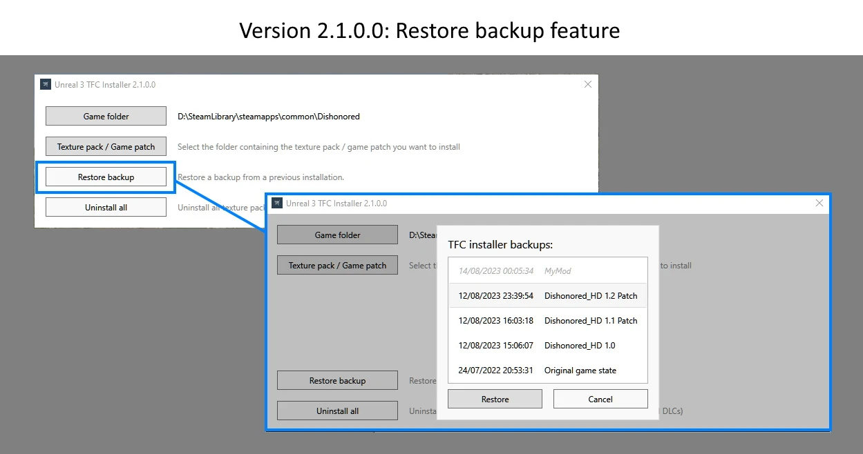 - Easily uninstalls mods with a click of a button and restores the backed up UPK, should a user change their mind.