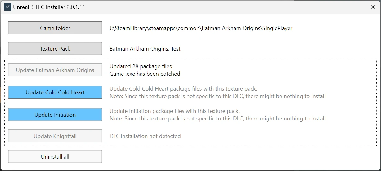 Clicking uninstall all will restore your game to its original state, uninstalling all texture packs.